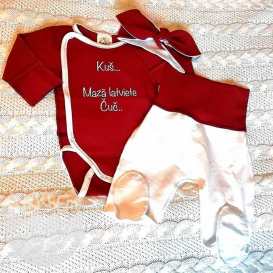 Komplektiņš mazam latvietim "Kuš...mazais latvietis čuč..." balts ar bordo